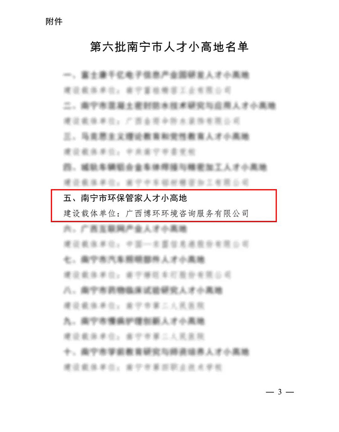 近日,中共南寧市委員會(huì)辦公廳、南寧市人民政府辦公廳聯(lián)合發(fā)布《中共南寧市委組織部南寧市人力資源和社會(huì)保障局關(guān)于公布第六批南寧市人才小高地名單的通知》(南辦發(fā)〔2018〕30號(hào)),其中廣西博環(huán)環(huán)境咨詢服務(wù)有限公司順利入選“南寧市環(huán)保管家人才小高地”載體單位。